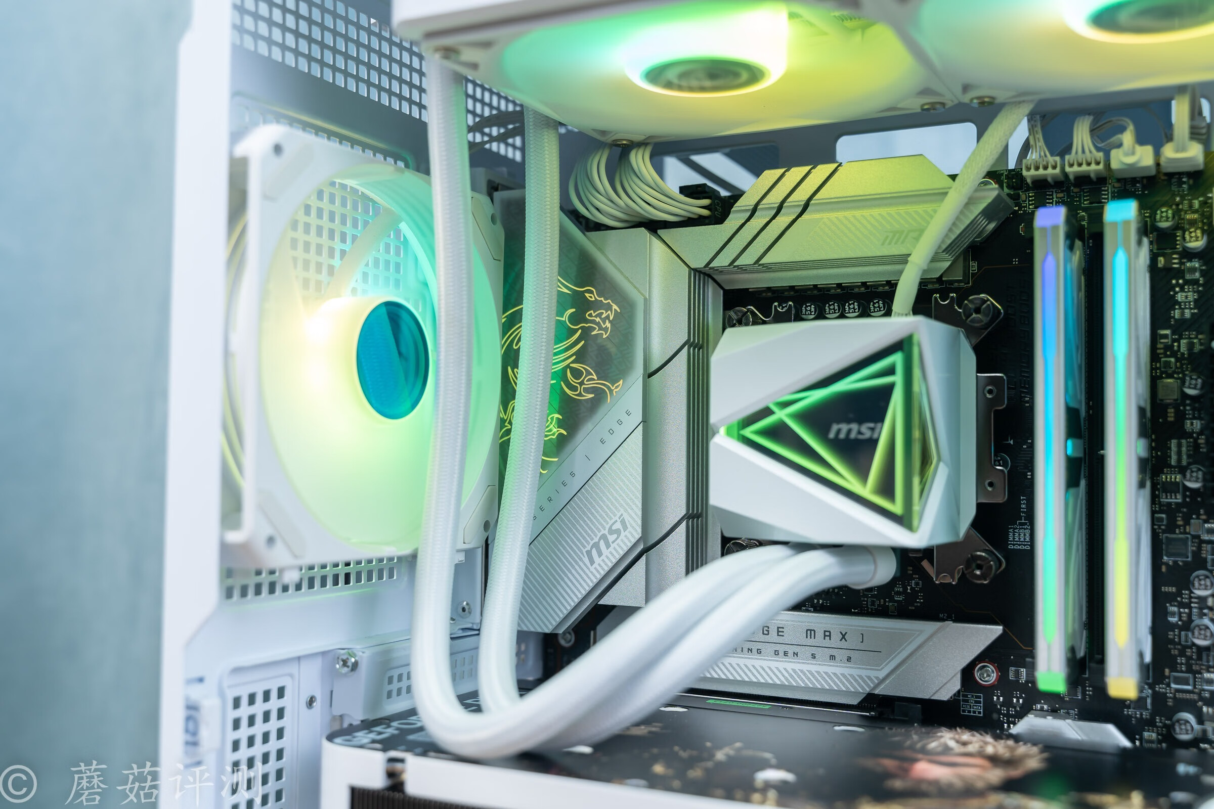 ▼處理器輕松安裝,整機的顏值還是非常漂亮的,白色主題配色的整機。主板用的是微星的MPG Z790 EDGE TI MAX WIFI刀鋒鈦,水冷用的是微星的MAG CORELIQUID I360 WHITE寒冰,機箱是微星的MAG PANO 100L PZ WHITE白刃PLUS。