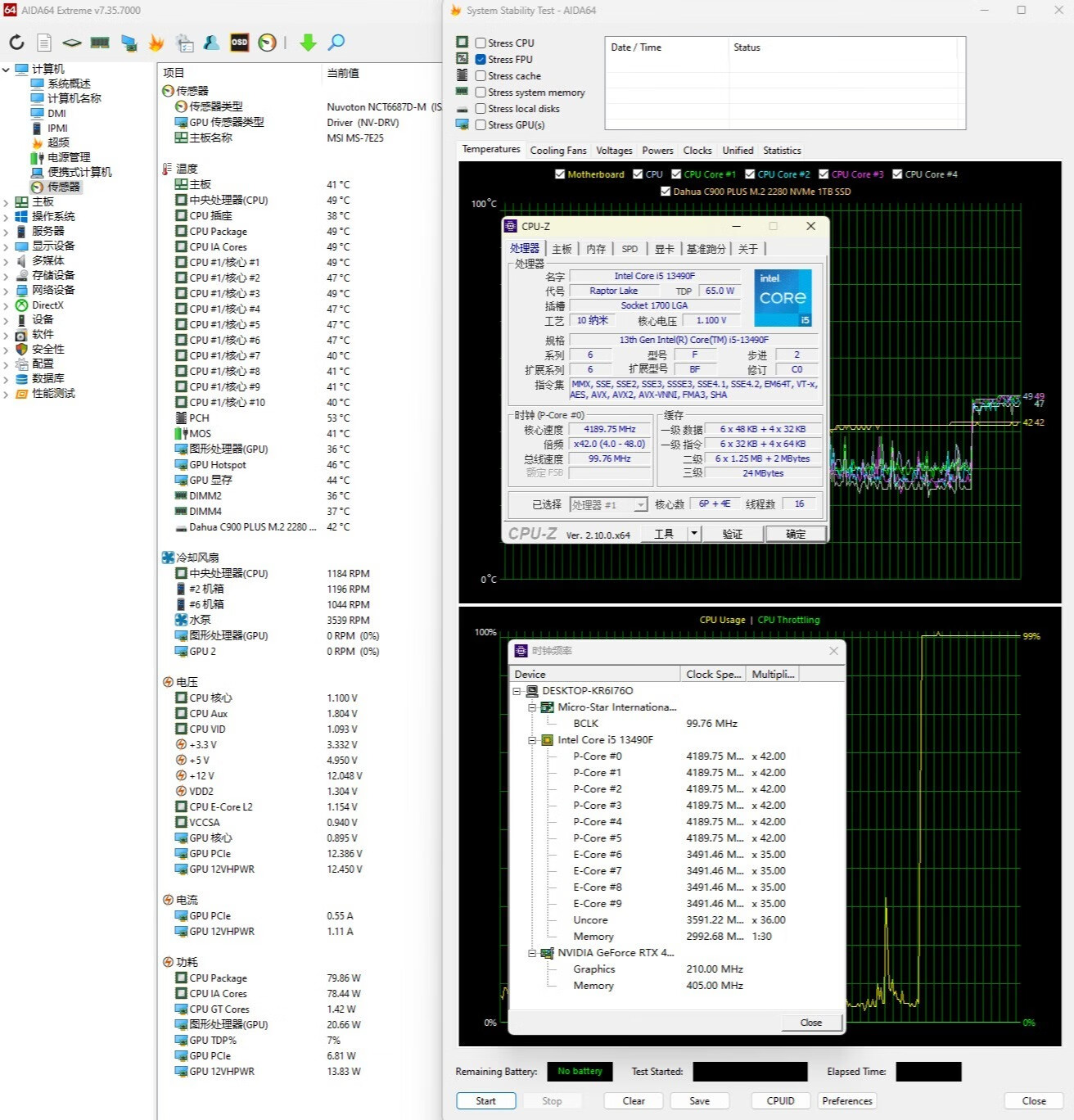 ▼跑個CPU-Z的壓力測試,大核心睿頻4.2GHz、小核心睿頻3.5GHz,功耗在80W左右,溫度49℃,很涼快。