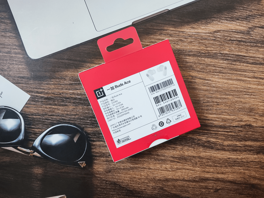 在包裝設計上,一加 Buds Ace依然采用經典的紅白配色,包裝正面左側一加紅區域是一加Logo與產品名稱,右側白色區域是產品簡筆畫圖,背面則是產品的參數信息,整體設計簡約。
