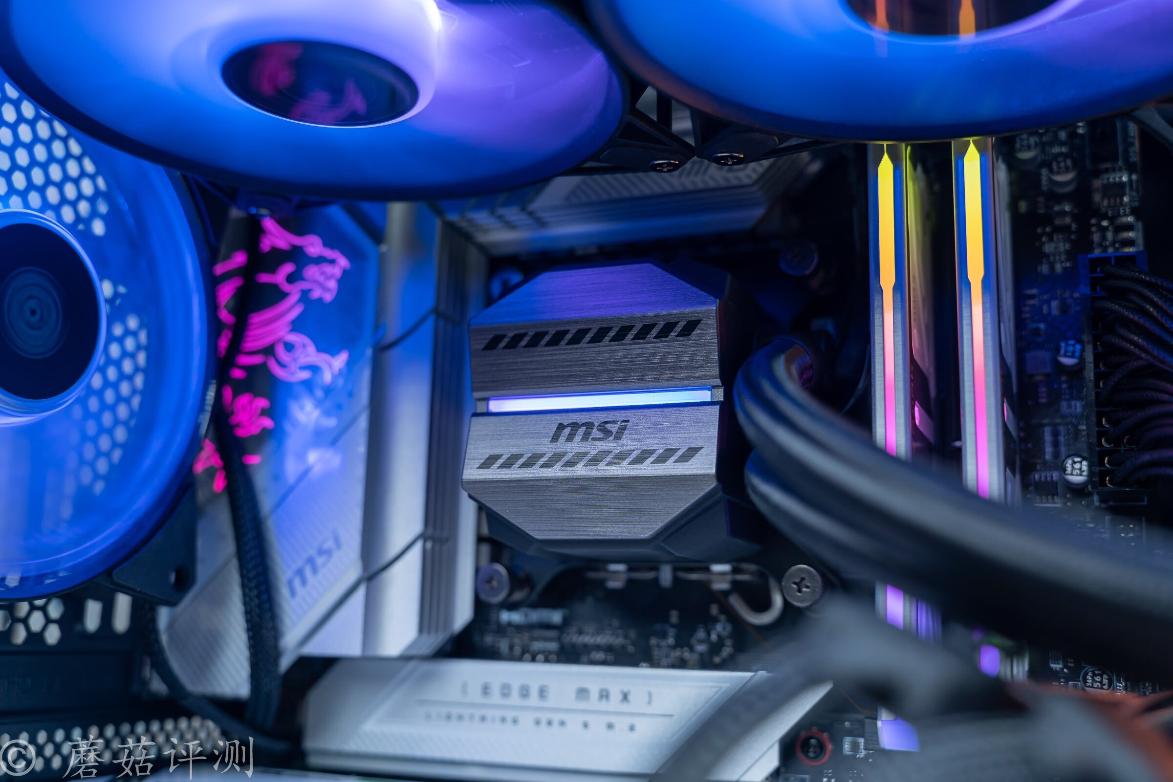▼主板是微星的Z790 EDGE TI MAX,這塊主板的正面覆蓋有完整的金屬覆蓋件,尤其是供電電路部分,左側(cè)和上側(cè)均有大體積的金屬散熱塊,并且在兩塊金屬散熱塊之間使用熱管均熱,提高散熱系統(tǒng)整體的散熱效率,并在左側(cè)散熱件的頂部設(shè)計了一個塑料裝飾件,有微星的龍標LOGO,支持ARGB燈效,支持主板同步。