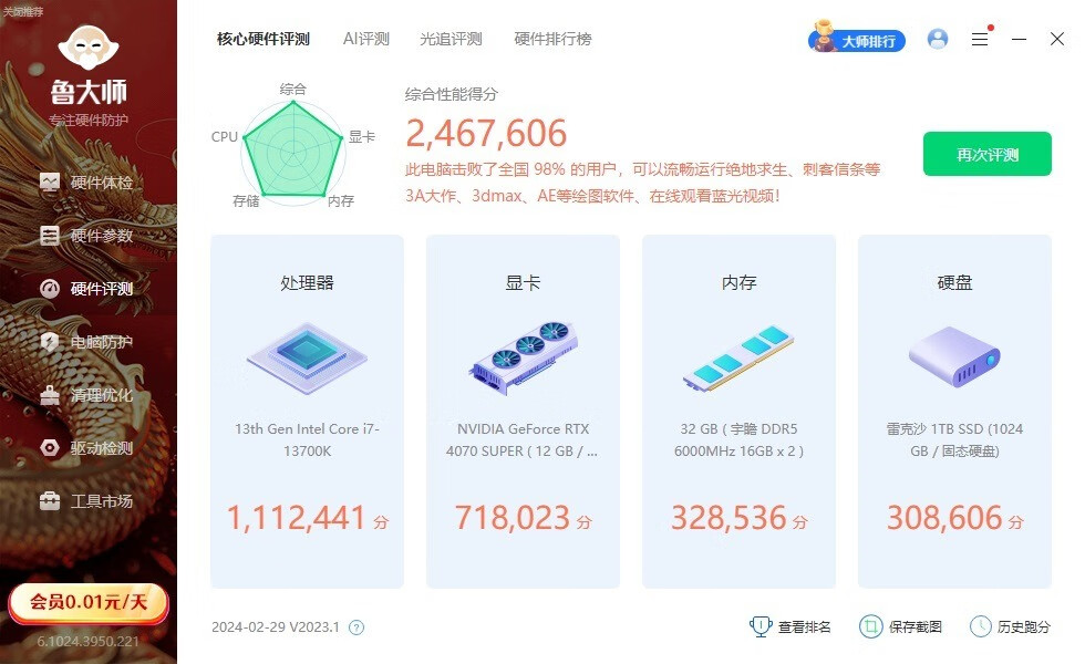 ▼顯卡是影馳的RTX4070 Super星曜OC,這張顯卡的顏值、性能和散熱表現(xiàn)都非常不錯。