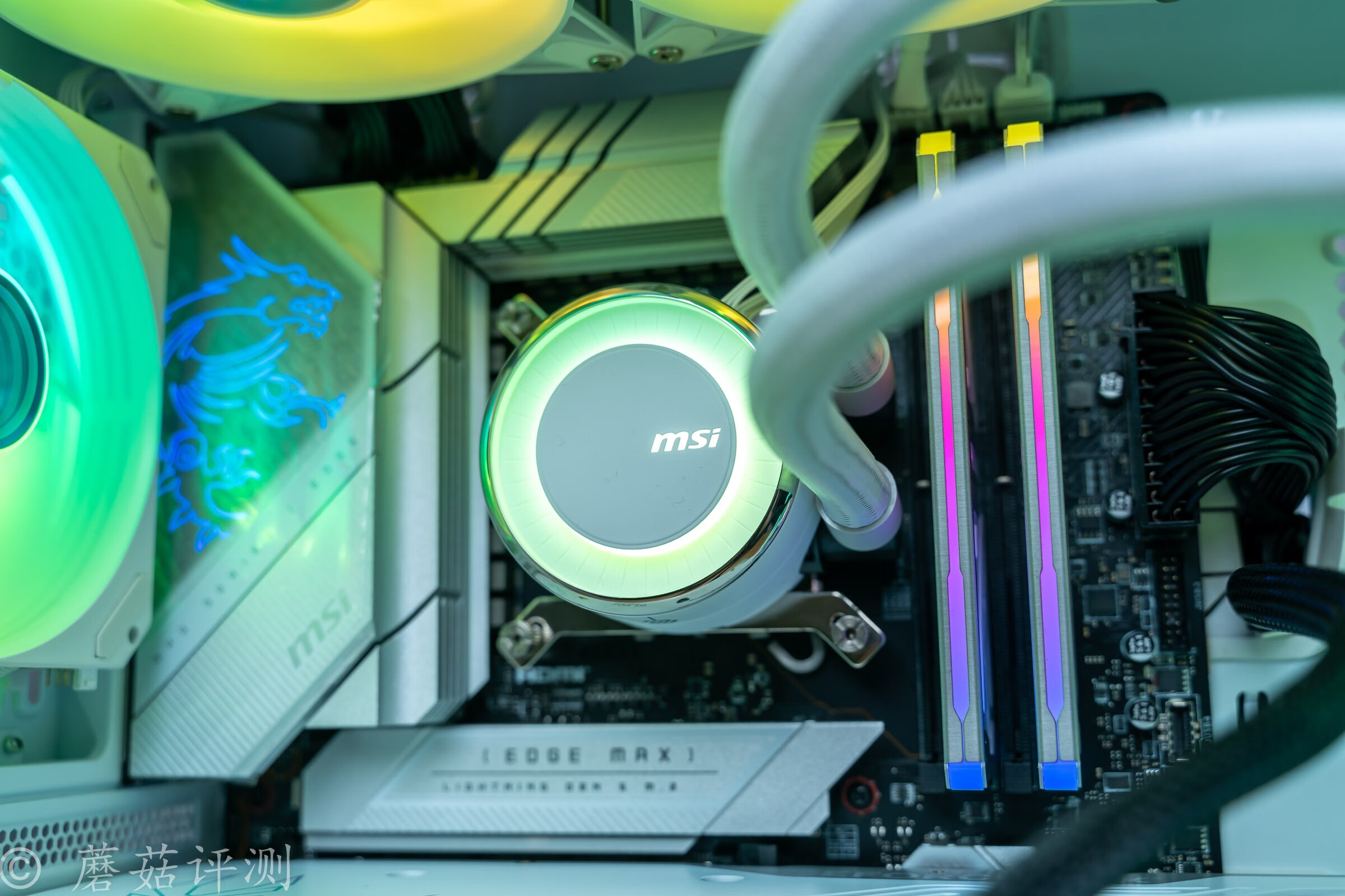 ▼微星寒冰E360白色限定版水冷的水冷頭設計的很有意思,中間是圓形的,外面有一圈弧形的造型,RGB燈效通過水冷頭中間圓形的側面透出,燈效更加柔和,視覺觀感更好看。