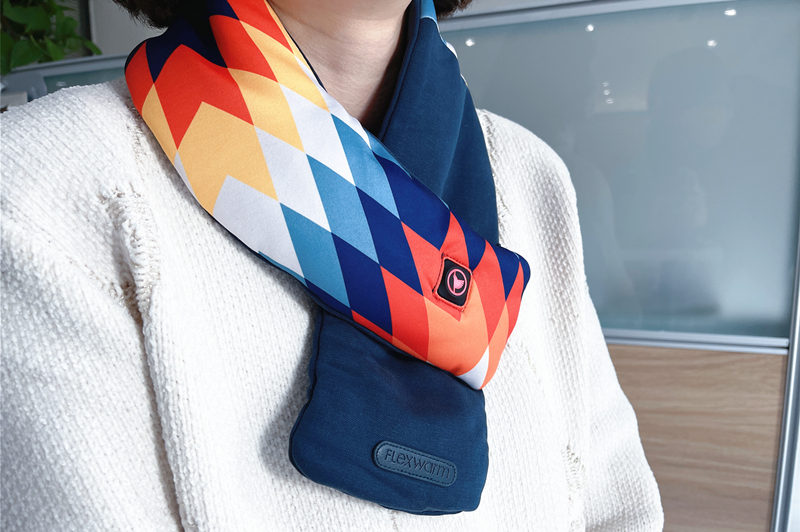 ▲飛樂思發熱圍巾分為行家里手、粉紅秘境、交織熱浪、粉黛千鳥、墨黛千鳥五款配色,我選的是交織熱浪,使用粉橙藍白幾種顏色拼湊,行程了整體兩部分視覺對比,兩性均可使用。整體設計分為鎖溫層、發熱膜、恒溫層,自帶遠紅外光波促進血液循環,面料采用豐盈杜邦棉,織染柔軟親膚。